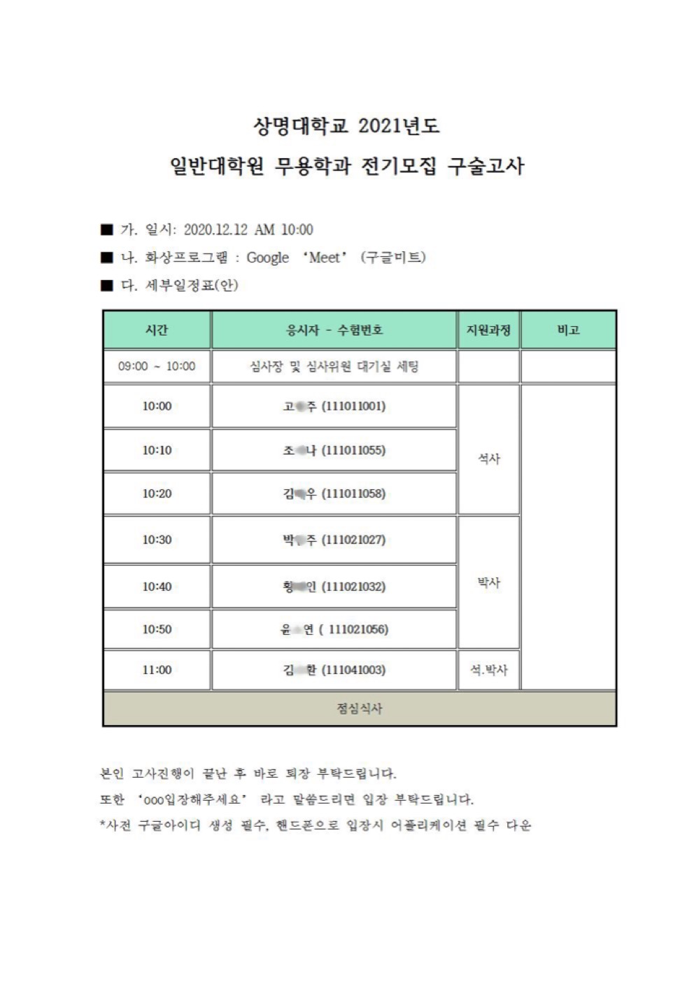 - [무용학과] 2021년도 일반대학원 전기모집 구술고사 안내.
